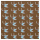 Fabric with a tiled artwork of a Horseshoe and Blue Feathers with a brown background.