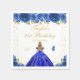 This elegant and glamourous birthday party napkin features a beautiful princess with blonde hair and fair skin in a royal blue ball gown. The text combines handwritten script and modern sans serif fonts for a classy and sophisticated look. The floral arrangements, butterflies and gold confetti create the perfect blend of rustic and chic.