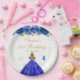 This elegant and glamourous birthday party plate features a beautiful princess with blonde hair and fair skin in a royal blue ball gown. The text combines handwritten script and modern sans serif fonts for a classy and sophisticated look. The floral arrangements, butterflies and gold confetti create the perfect blend of rustic and chic.