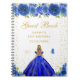 This elegant and glamourous birthday party guest book features a beautiful princess with blonde hair and fair skin in a royal blue ball gown. The text combines handwritten script and modern sans serif fonts for a classy and sophisticated look. The floral arrangements, butterflies and gold confetti create the perfect blend of rustic and chic.
