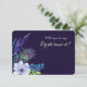 Ask her to be your bridesmaid with this pretty boho watercolor floral image card! It features your custom text in light gold on a field of dark blue. A blue floral watercolor embellishment, including a boho style pattern peacock feather and blue berries decorate the right side. The back of the card has extra text fields for you to customise on the same blue background. This card matches wedding invitations and other wedding products in our store.