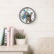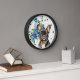 Tucked into this arrangement of watercolor blue and purple flowers is a cute image of a black French Bulldog wearing a bow tie. Black numbers and markers around the perimeter make this clock easy to read. Everything is placed on a white background.