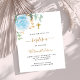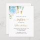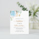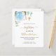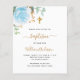 A white background decorated with eucalyptus greenery, a light blue rose, and golden leaves. Personalise and the childs name and ceremony details. Black and golden coloured letters.