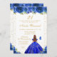 This elegant and glamorous birthday party invitation features a beautiful princess with brown red hair and fair skin in a royal blue ball gown. The text combines handwritten script and modern sans serif fonts for a classy and sophisticated look. The floral arrangements, butterflies and gold confetti create the perfect blend of rustic and chic.