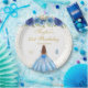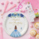 This elegant and glamourous birthday party plate features a beautiful princess with brown red hair and fair skin in a blue ball gown. The text combines handwritten script and modern sans serif fonts for a classy and sophisticated look. The floral arrangements, butterflies and gold confetti create the perfect blend of rustic and chic.