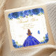 This elegant and glamourous birthday party thank you sticker features a beautiful princess with brown red hair and fair skin in a royal blue ball gown. The text combines handwritten script and modern sans serif fonts for a classy and sophisticated look. The floral arrangements, butterflies and gold confetti create the perfect blend of rustic and chic.