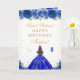 This elegant and glamourous sweet sixteen birthday card can be personalised with a name or title such as daughter, granddaughter, niece, friend etc. The design features a beautiful princess with brunette hair and fair skin in a royal blue ball gown. The text combines handwritten script and modern sans serif fonts for a classy and sophisticated look. The floral arrangements, butterflies and gold confetti create the perfect blend of rustic and chic.