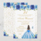 This elegant and glamorous birthday party invitation features a beautiful princess with brunette hair and fair skin in a blue ball gown. The text combines handwritten script and modern sans serif fonts for a classy and sophisticated look. The floral arrangements, butterflies and gold confetti create the perfect blend of rustic and chic.