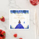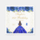 This elegant and glamourous birthday party napkin features a beautiful princess with brunette hair and fair skin in a royal blue ball gown. The text combines handwritten script and modern sans serif fonts for a classy and sophisticated look. The floral arrangements, butterflies and gold confetti create the perfect blend of rustic and chic.
