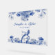 Create a personalised sign that has the look of antique china. This clear acrylic sign is ready to be personalised with the names of the bride and groom and their wedding date or with your own custom message. It has a blue and white floral and bird motif that's made to look like traditional china plates for party supplies with an elegant look.