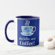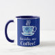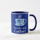 Mug in a stylised coffee cup is filled with a blue floral pattern and topped with rising steam. Below, the phrase “less talkee, more Coffee!” adds a humourous, relatable touch perfect for coffee lovers.