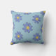 Pattern of graphical flowers. Each flower has 8 blue petals, centre is yellow. Same print on both sides of the pillow. Solid background colour can be customised to create effects matching your taste.