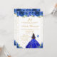 This elegant and glamorous birthday party invitation features a beautiful princess with dark hair and dark skin in a royal blue ball gown. The text combines handwritten script and modern sans serif fonts for a classy and sophisticated look. The floral arrangements, butterflies and gold confetti create the perfect blend of rustic and chic.