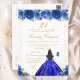 This elegant and glamourous birthday party invitation features a beautiful princess with dark hair and dark skin in a royal blue ball gown. The text combines handwritten script and modern sans serif fonts for a classy and sophisticated look. The floral arrangements, butterflies and gold confetti create the perfect blend of rustic and chic.