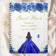 This elegant and glamourous sweet sixteen guest book features a beautiful princess with dark hair and dark skin in a royal blue ball gown. The text combines handwritten script and modern sans serif fonts for a classy and sophisticated look. The floral arrangements, butterflies and gold confetti create the perfect blend of rustic and chic.