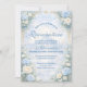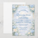 This elegant quinceañera design features a soft sky-blue watercolor background framed by lush florals, delicate roses, and refined gold ornamental details. Inspired by classic European garden stationery, the composition balances romantic florals with a light, airy center that keeps the text clear and readable when printed.