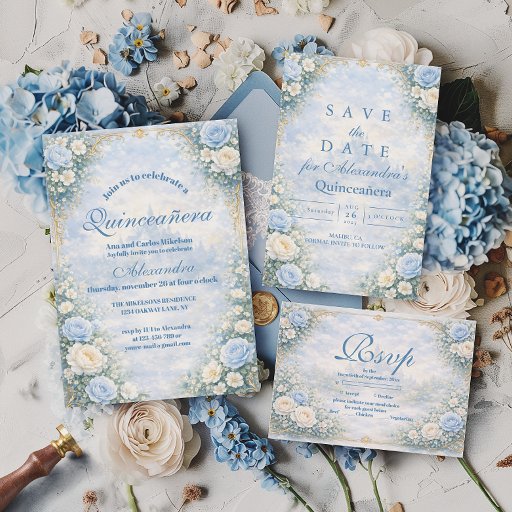 This elegant quinceañera design features a soft sky-blue watercolor background framed by lush florals, delicate roses, and refined gold ornamental details. Inspired by classic European garden stationery, the composition balances romantic florals with a light, airy centre that keeps the text clear and readable when printed.