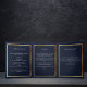 An elegant tri-fold program. A navy blue background, a faux gold frame, blue florals and space for a photo. Personalise and add name, dates and your text.