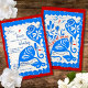 Mexican blue & red floral papel picado Mexican wedding invitation. Handmade look! Celebrate your special day with our exquisite Mexican wedding invitation that perfectly captures the essence of a Mexican fiesta-style wedding. Inspired by the timeless tradition of handmade papel picado, this invitation showcases intricate Mexican blue papel picado drawings with two decorative pink drops, adding a vibrant touch to the boho simple, modern, and elegant design. The unique handmade look of the invitation ensures a truly authentic feel, with soft whites that blend seamlessly into the colourful backdrop.