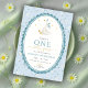 The illustration is beautifully set inside an elegant scalloped oval frame, adding a timeless touch, while the light blue floral background brings warmth, softness, and joy to the overall design. The soothing color palette and delicate details make it ideal for a baby boy’s first birthday celebration.