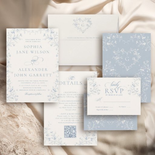 Complete your timeless wedding suite with this elegant Classic French RSVP card. Featuring delicate blue chinoiserie florals, refined Victorian styling, and romantic calligraphy script, this response card blends old-world charm with modern convenience.