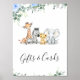 Sweet safari baby animals themed baby shower gifts and cards sign for a baby boy's baby shower. This design features a watercolor giraffe, elephant, zebra and lion and is ideal for safari themed baby shower.