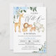 Sweet safari or wild one themed boy's baby shower invitation featuring four cute watercolor animals, two blue floral arrangements and a modern calligraphy heading that is removable. This boy's a little wild one is on the way baby shower invitation also features a floral pattern design on the back. It's Ideal for someone looking for a boy's safari themed baby boy's baby shower invitation.
