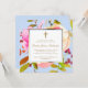 Beautiful watercolor floral bouquet with gold colour cross, greenery, berries, and faux gold frame on the front of the card, and blue background with white polka dot pattern on the back of this trendy and elegant baptism invitation.