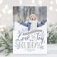 Affordable custom printed holiday photo cards with a simple template for customisation. This cheerful design features whimsical floral elements and fun hand-lettered style typography in winter blue and grey colours. The text reads "May your heart be filled with the love and joy of the holidays". Personalise it with your photo, names and the year. Inside has space for additional photos and text. Use the design tools to edit the text fonts and colours or add more photos to create a unique one of a kind Christmas photo greeting card.