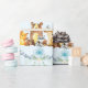 This design features adorable baby woodland animals surrounded with watercolor dusty blue flowers and green leaves