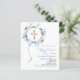 An elegant white background, decorated with watercolored blue flowers in a wreath, a blue bow and a golden cross. Personalise and add a name and details.