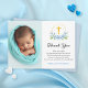 Blue florals and gold cross boy baptism photo thank you card