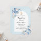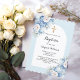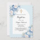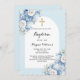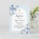 A white arch frame and light blue background. Decorated with blue and white flowers. A golden cross. Personalise and add a name and details.