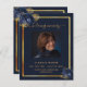An elegant 2-page program. A dark blue background, a faux gold frame, blue florals and space for a photo. Personalise and add name, dates and your text.