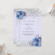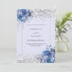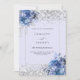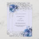 A soft lavender coloured background decorated with blue roses, flowers and faux silver confetti. Personalise and add your names and wedding details. Black letters.