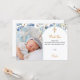 Add your own vertical size photo. A baby blue coloured arch shaped photo frame. A white background colour, decorated with blue forals, flowers. Personalise and add a name and details.