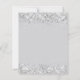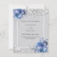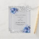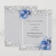 A grey background decorated with blue roses, flowers and faux silver confetti. Personalise and add your names and wedding details. Black letters.
