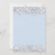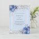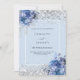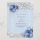 A light blue background decorated with blue roses, flowers and faux silver confetti. Personalise and add your names and wedding details. Black letters.