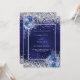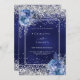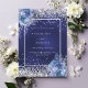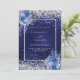A navy blue, uneven coloured background decorated with blue roses, flowers and faux silver confetti. Personalise and add your names and wedding details. Black letters.