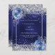 A navy blue, uneven coloured background decorated with blue roses, flowers and faux silver confetti. Personalise and add your names and wedding details. Black letters.