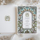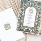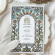This Art Nouveau-inspired wedding invitation features a serene arrangement of blue flowers, golden accents, and lush green foliage. The intricate border design is adorned with flowing lines and organic motifs, reflecting the timeless sophistication of the Art Nouveau movement. A gentle colour palette of soft blues, warm golds, and muted greens creates a calming yet elegant aesthetic. Perfect for vintage, garden, or nature-themed weddings, this customisable invitation is a refined choice to celebrate your special day with style and grace.