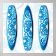 Art poster with a design of three blue surfboards with blue tropical flower patterns against a pale blue and white background with floral motif. Perfect for the Summer to inspire thoughts of Hawaii and the beach. For lovers of surfing and beach lifestyle everywhere.