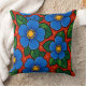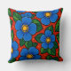 Blue Flowers and Green Leaves on a Red Background Cushion