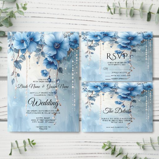 Blue Flowers and Pearls Wedding Invitation