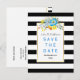 Pretty aqua blue and yellow folklore flowers, chic black and white striped pattern and your text on a white frame adorn this outstanding wedding Save the Date postcard. Choose it for your spring or summer wedding.
