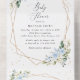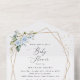 Invite friends and family in style and set the tone for your special day with this charming baby shower invitation. Design features blue and white watercolor flowers, greenery, gold confetti and gold frame on white background.