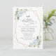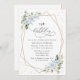 Invite friends and family in style and set the tone for your special day with this charming birthday invitation. Design features blue and white watercolor flowers, greenery, gold confetti and gold frame on white background.