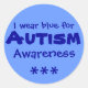 Blue round sticker with blue font: "I wear blue for Autism Awareness"