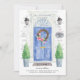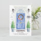 Announce your new address with our stylish announcement featuring a blue front door, welcome mat, slate sign, topiaries and a floral wreath set on a grey brick background.