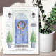Announce your new address with our stylish announcement featuring a blue front door, welcome mat, slate sign, topiaries and a floral wreath set on a grey brick background.